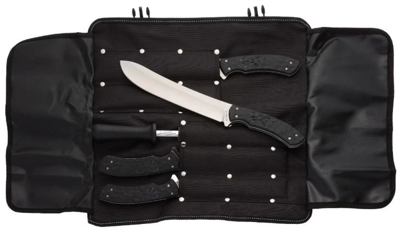 Everything a hunter needs for processing game at home. Includes butcher, deboning, filet and trimming knives plus sharpening rod. Knives and shaprening rod all fit into included nylon tool roll.
