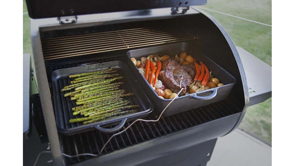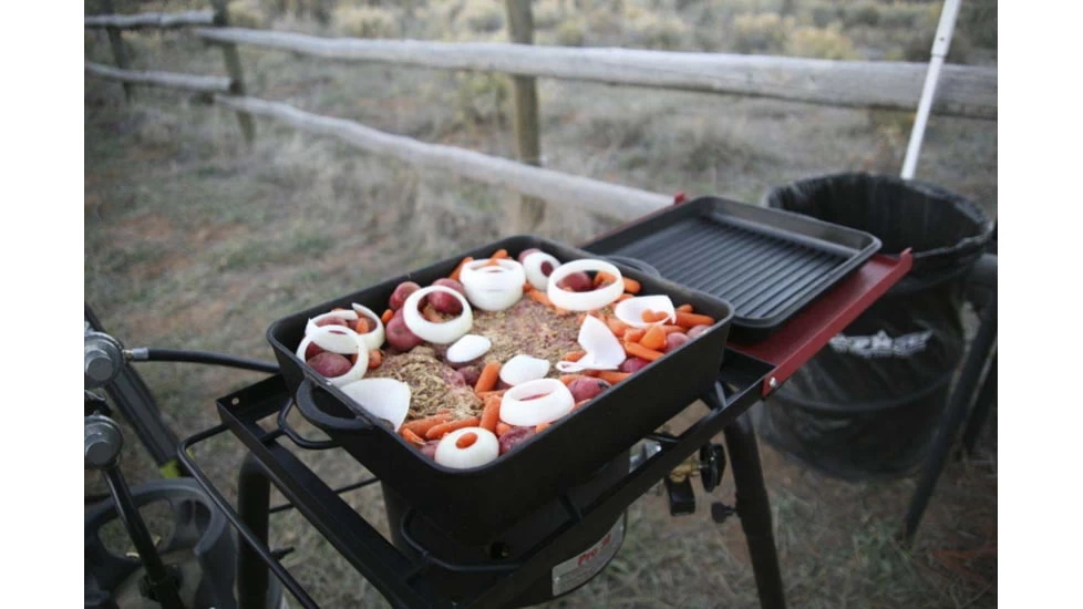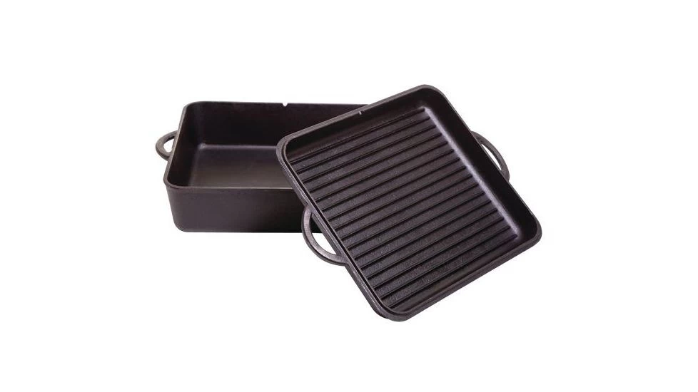 From the kitchen to the campsite the Square Dutch Oven is perfect for roasts, casseroles, ribs, breads, and much more. The eight quart capacity is large enough for all your cooking needs. The legless design makes it perfect for use in your home kitchen. This cast iron piece gives cooking superiority by evenly distributing heat to cook your food to perfection. Checking temperatures is easy with the thermometer notch allowing you to insert a probe without lifting the lid. To expand versatility the lid has been designed with raised ribs so it can double as a grill on your stove.![]()