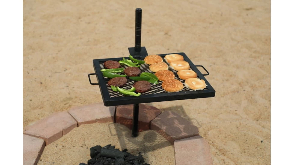The Gravity Grill can be used with any type of fire; from wood, charcoal, propane units or even high-temperature turkey burners, this heavy-duty grill can handle it all & can easily be adjusted. Each grill & griddle can independently rotate 360 degrees, moving it off fire to serve or one direction or another away from hot spots. They can also adjust up or down for the perfect cooking temperature.