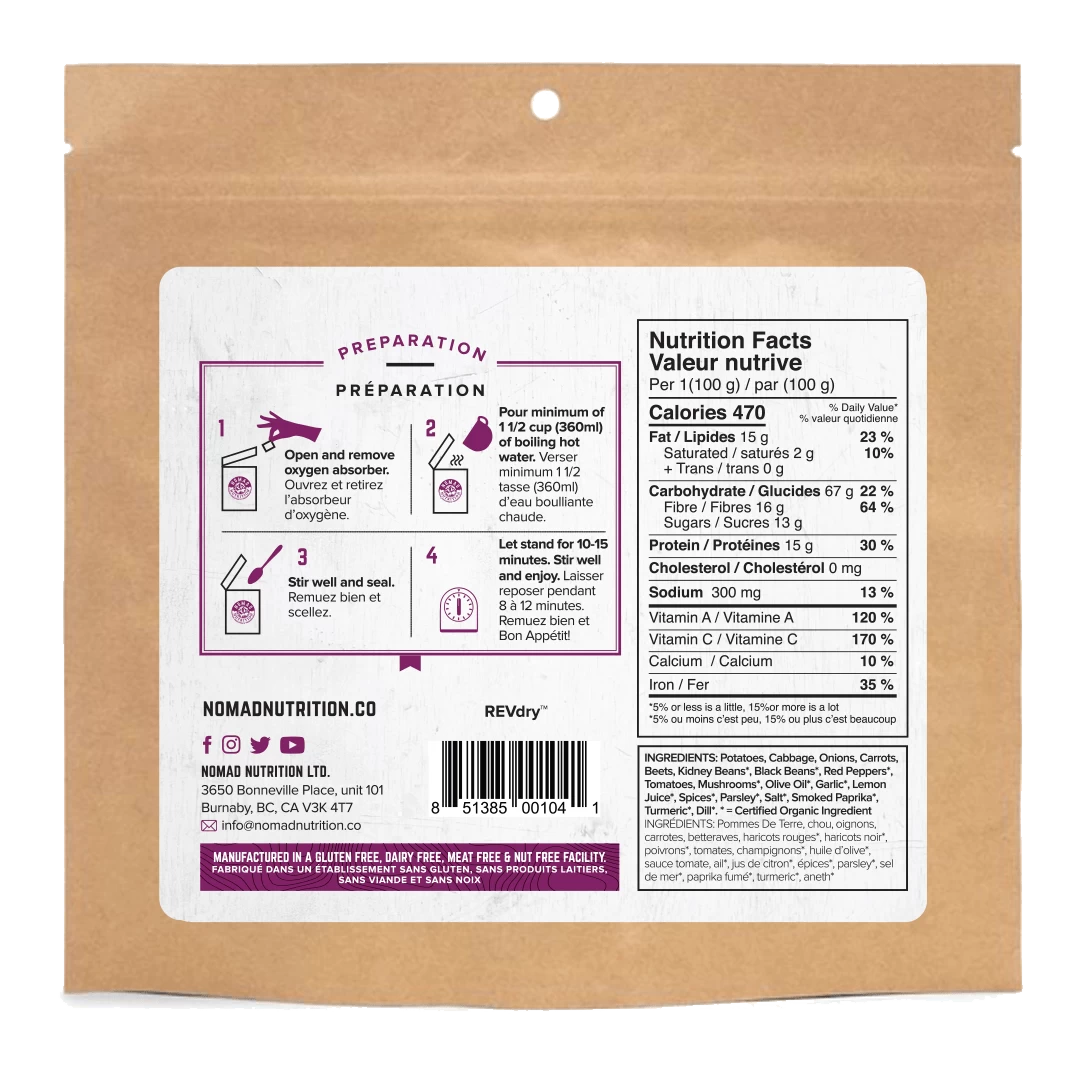 INGREDIENTS: Potatoes, Cabbage, Onions, Carrots, Beets*, Kidney Beans, Lentils, Tomatoes, Tomato Paste*, Mushrooms*, Olive Oil*, Garlic, Lemon Juice, Parsley*, Sea Salt*, Smoked Paprika*, Caraway*, Turmeric*, Black Pepper*. * = Certified Organic Ingredient.