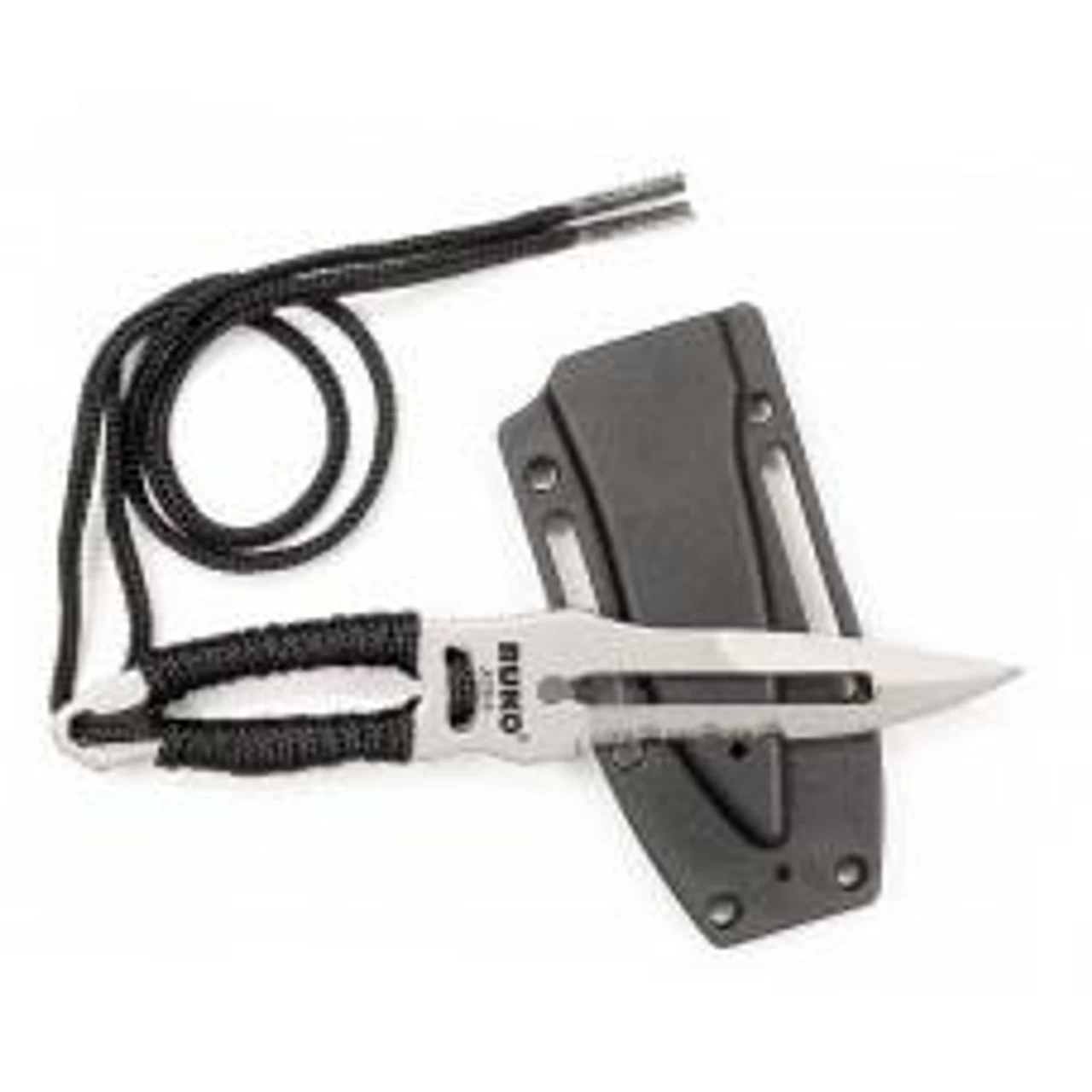 Hawker boot/neck knife. AUS-6 stainless steel clip point 50/50 serrated blade, bead blast finish, 2-position Zytel self-locking boot clip sheath, lanyard, blade: 2-1/2″, closed: 5-1/4″