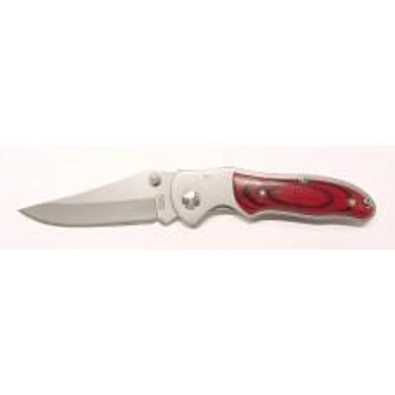Pakkawood scale folding knife, stainless steel handle, 440A bead blast finish stainless steel blade, liner lock design, metal thumb stud and pocket clip. Blade Length: 3-1/4″ Closed length: 4-1/2″.
