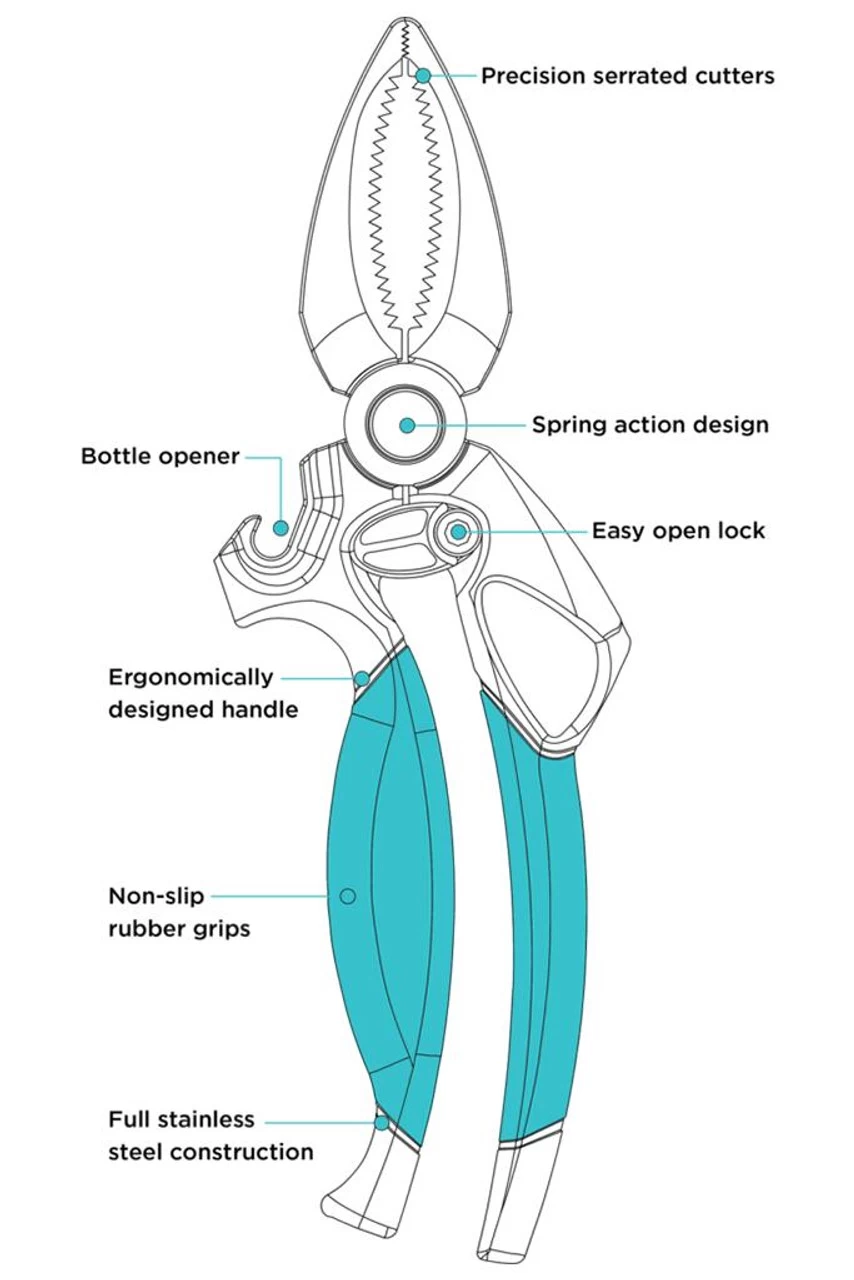 Flip open the locking hinge on the crab cutter. Place a crab claw into the open serrated jaws right above the crab claw joint. Slowly close the cutter around the claw until the serrated teeth create a perfect cut. Then slowly pull apart the claw revealing your intact crab claw meat.